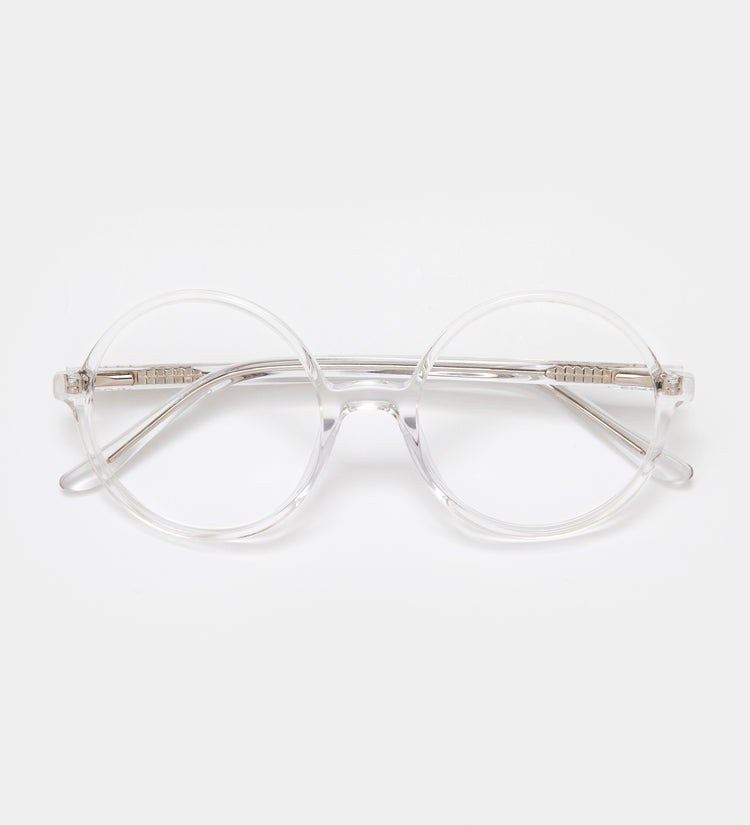 De Rakel Transparent Blue Light-bril heeft een strak rond montuur, gemaakt van heldere materialen, en combineert subtiele elegantie met geavanceerde bescherming tegen blauw licht. Deze verfijnde bril vermindert digitale oogvermoeidheid en behoudt een minimalistische, veelzijdige stijl voor dagelijks comfort.